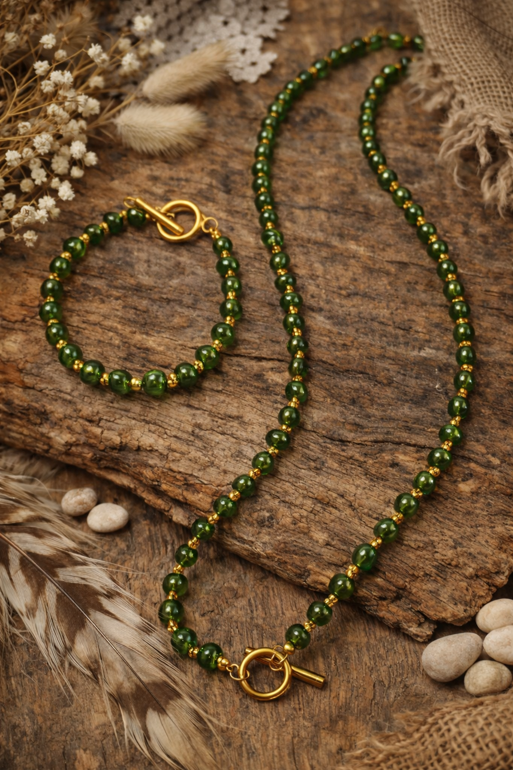 Χειροποίητο κολιέ, φτιαγμένο με προσοχή στη λεπτομέρεια και αγάπη για τη φύση. Οι χάντρες από πράσινο και χρυσό γυαλί χαρίζουν βάθος και λάμψη, ενώ τα μεταλλικά στοιχεία είναι από ανοξείδωτο ατσάλι, για αντοχή στον χρόνο και καθημερινή άνεση.